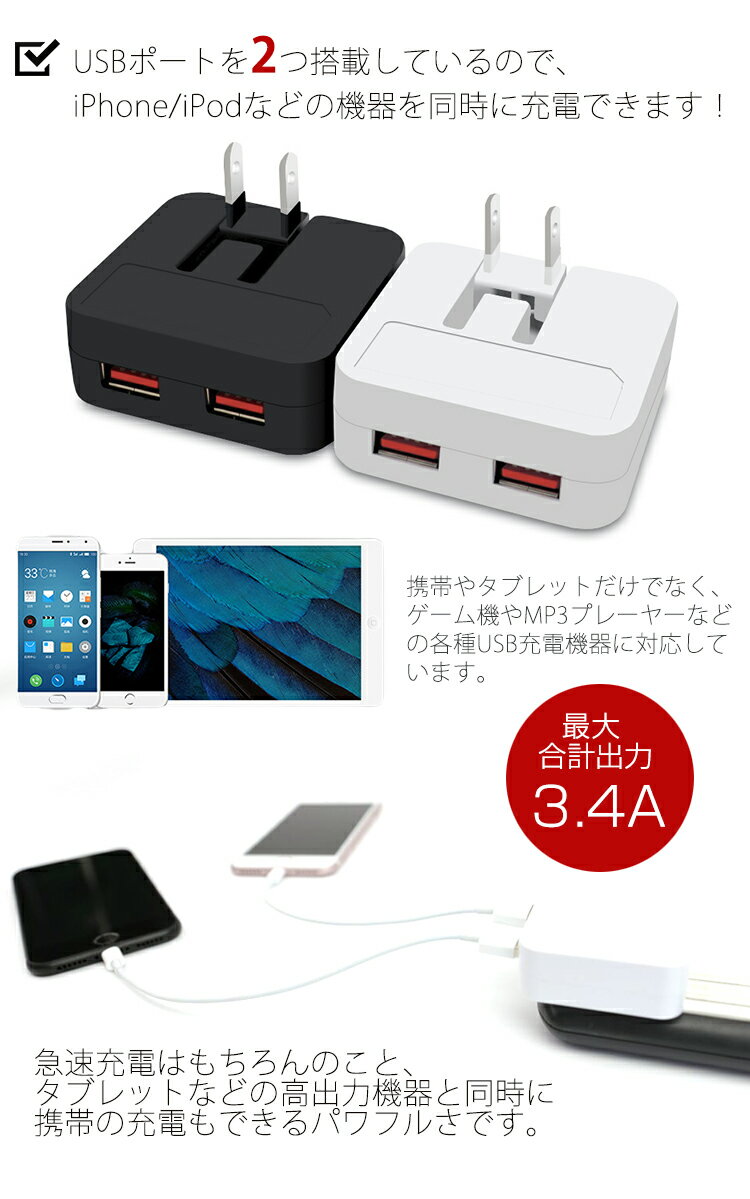 ▼お買得くセットもございます!▼ 価格1,500円(税込) 価格1,480円(税込) 価格1,700円(税込) 価格2,100円(税込) Item Information 商品名 iPhone 充電器【ゆう】スマホ充電器 USB コンセント ACアダプター USB充電器 3.4A 同時充電可能 2ポート2台同時充電 急速充電器 iphone android 多機種対応 iPhone7/7Plus アイフォンコンセント Xperia GALAXY 充電器 国内+海外対応 iPod 軽量 acアダプター iPhone 7/7Plus/SE/6s/6s Plus/6/6 Plus/5s/5c/5/4s/4/3GS iPad Pro12.9インチ/9.7インチiPad Pro/Air 2/Air/第4世代/第3世代/iPad2/初代iPad iPad mini 4/mini 3/mini 2/mini 各社スマートフォン・タブレットPC 対応 カラー ブラック ホワイト 商品説明 iPhoneや各社スマートフォン、ゲーム機等の充電に対応 2台同時充電可能! 100-240V海外対応 過電流保護機能 入力:AC 100-240V 出力:DC 5V-3400mA コネクタ形状:USB-Aメス サイズ:(約)55*55*21mm 材質:ABS樹脂+PC+合金 本体重さ:(約)55g 電気用品安全法:PSE適合(本体) ■家庭用コンセントからスマホ/タブレットなどを充電できます。