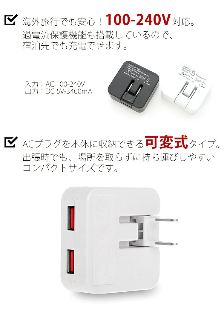 ■合計出力3.4Aの高出力タイプなので、タブレットも安心して充電可能です。