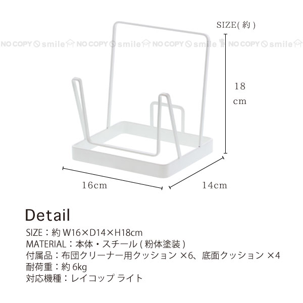 サイズ 約W16×D14×H18cm 素材・材質 本体・スチール(粉体塗装) 付属品 布団クリーナー用クッション×6 底面クッション×4 耐荷重 約6kg 対応機種 レイコップ ライト 備考 ※クリーナー等は付属しません。