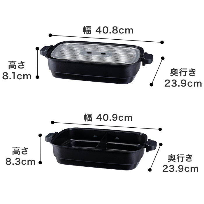 Detail 詳細 Size サイズ サイズ 平面プレート+フタ使用時:約 幅 398x奥行き 241x高さ 179mm (ハンドル含む) 重量 約2.9kg(本体+フタ+平面プレート装着時、電源コードは除く) 電源 AC100V 50/60Hz 消費電力 1300W 温度調節 保温(70度) ~ HIGH(220度) ヒーター フラットヒーター 電源コード マグネット式電源コード コード長 約2.0m 主材料 本体:鋼板 プレート:フッ素樹脂加工アルミダイキャスト 付属品 カラーレシピブック(24レシピ) 保証 お買い上げ後 1年間