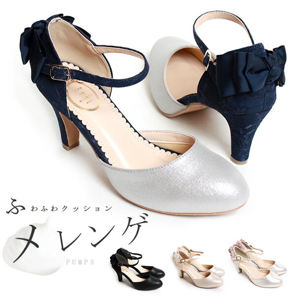 【あす楽】結婚式 パーティ フォーマル パンプス 痛くない ストラップ レディース/靴/ラウンドトゥ/リボンパンプス/オープン/入学式/卒業式/美脚/ゴールド/シルバ−/ベージュ/リボン【バックリボン&レース メレンゲクッション セパレート パンプス】ヘッジホッグ